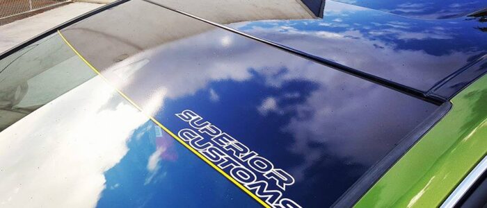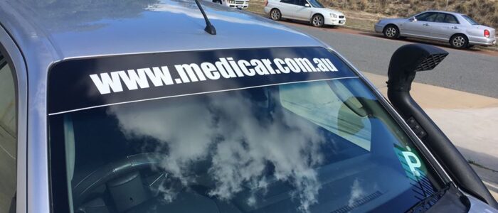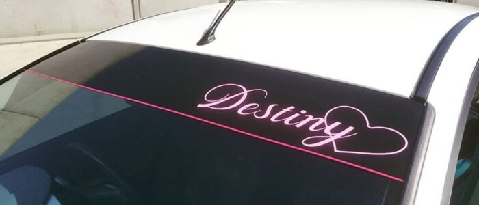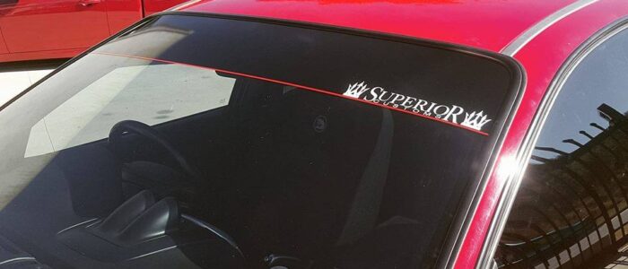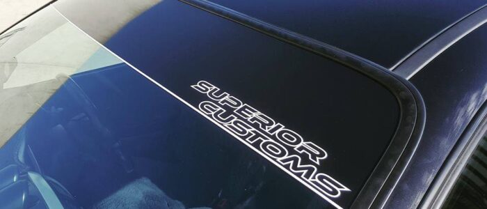 From a plain black windscreen banner to block the sun to full multi coloured custom printed banners we can do it all. Our standard banner is black with optional coloured pin stripe and Superior Logo, but we can then further customise with your own logos, cut outs for sensors, advertising, company logos and social media tags
